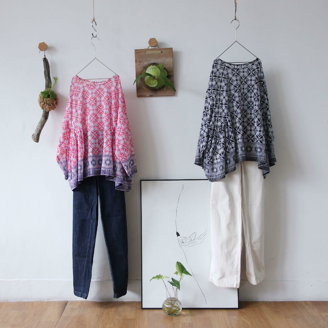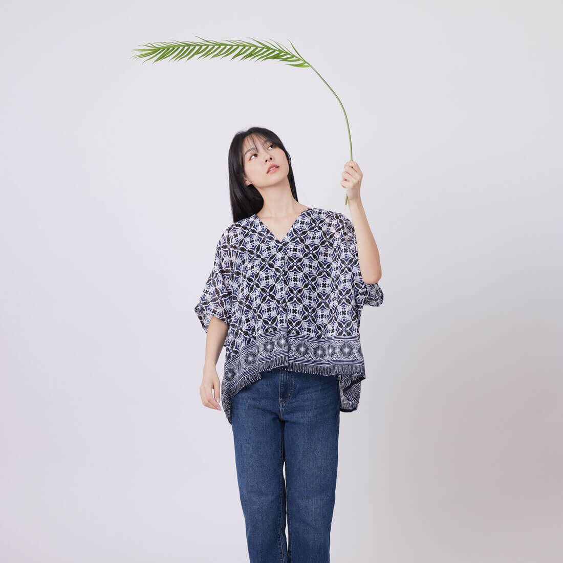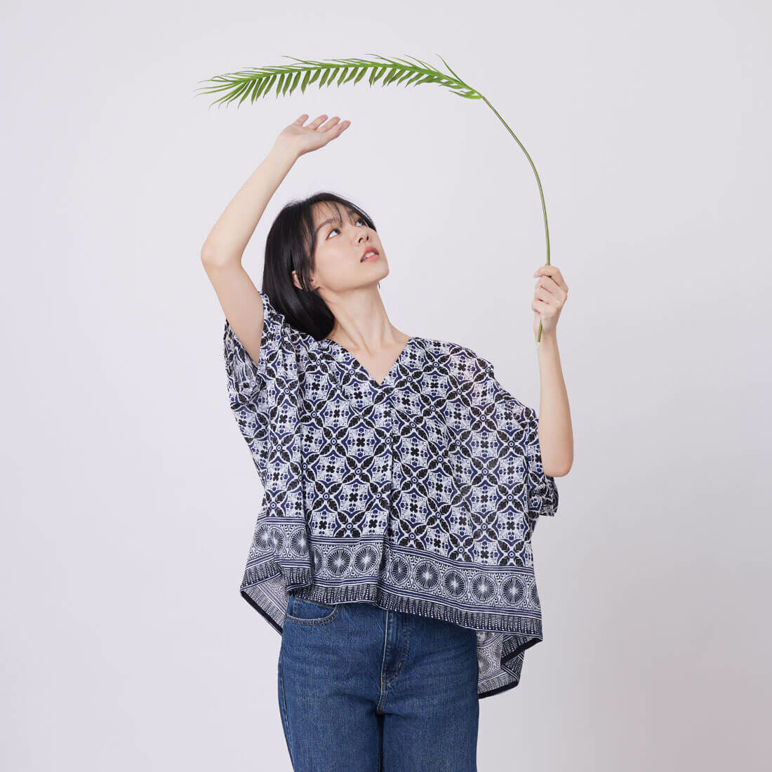 薄透自帶仙氣,穿上這件薄紗略帶透視的印花上衣,讓你感受到熱帶度假的風情。這款上衣搭配一件小背心,恰到好處的透明材質非常適合夏天穿搭。滿版仿木刻印花,帶有濃厚的民俗風氛圍。