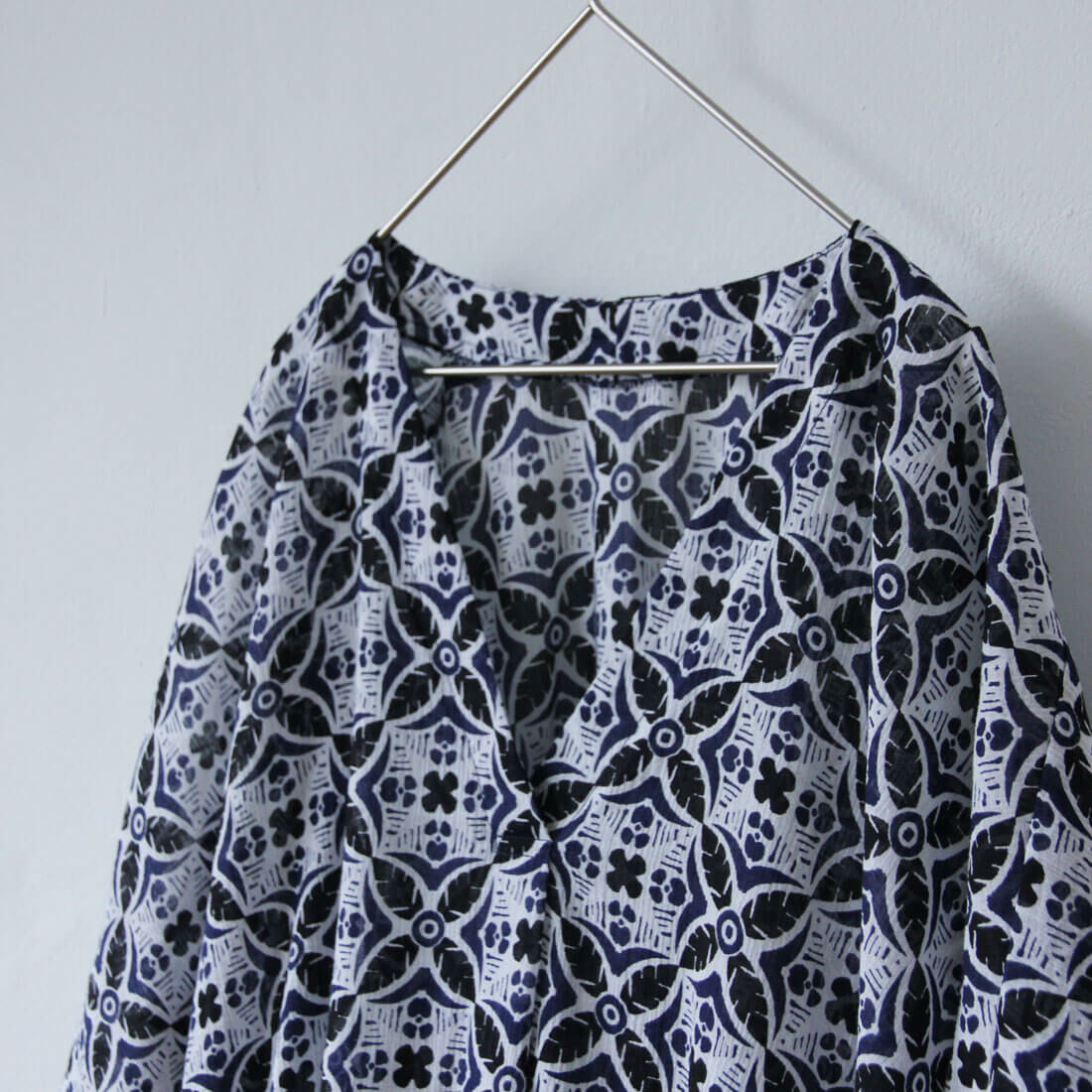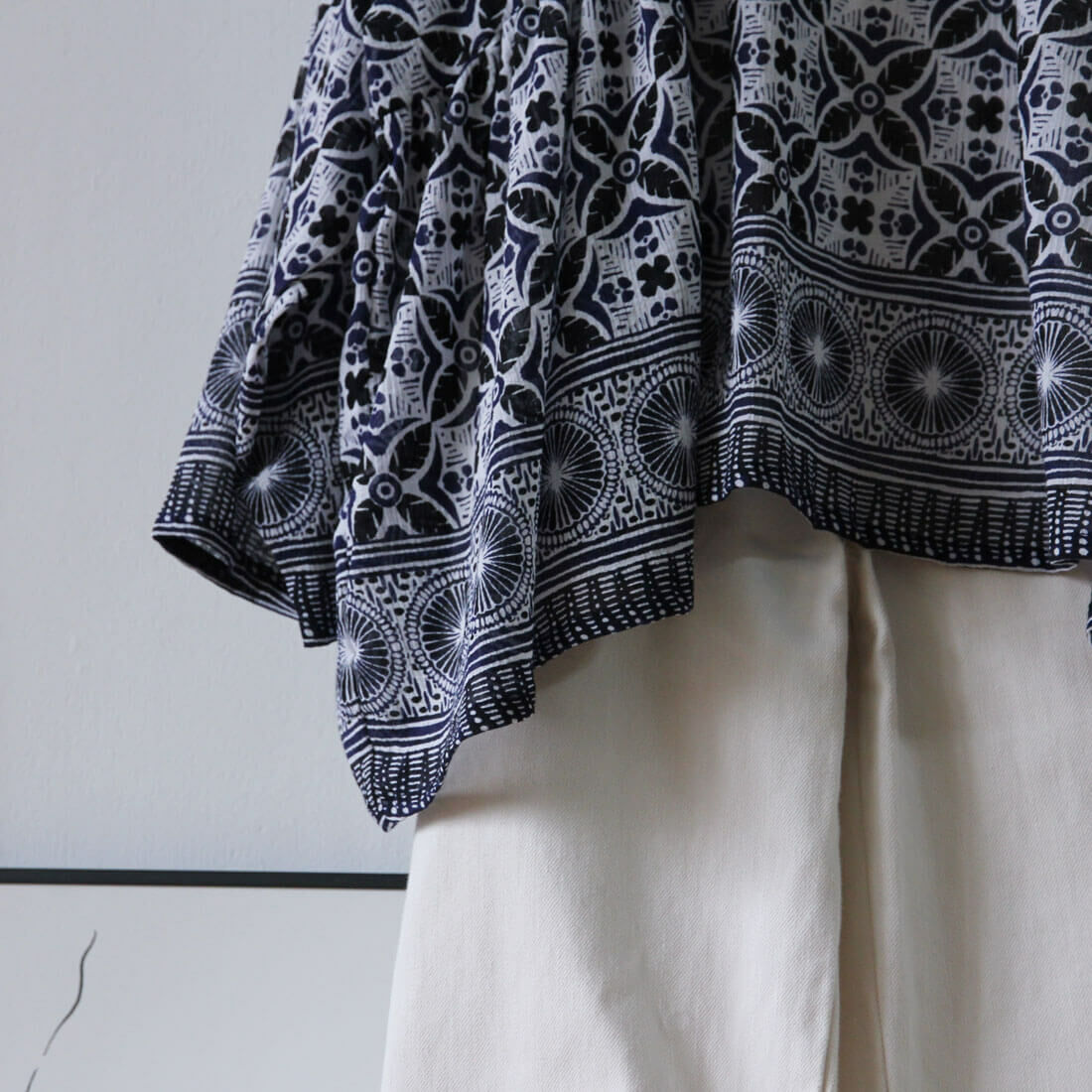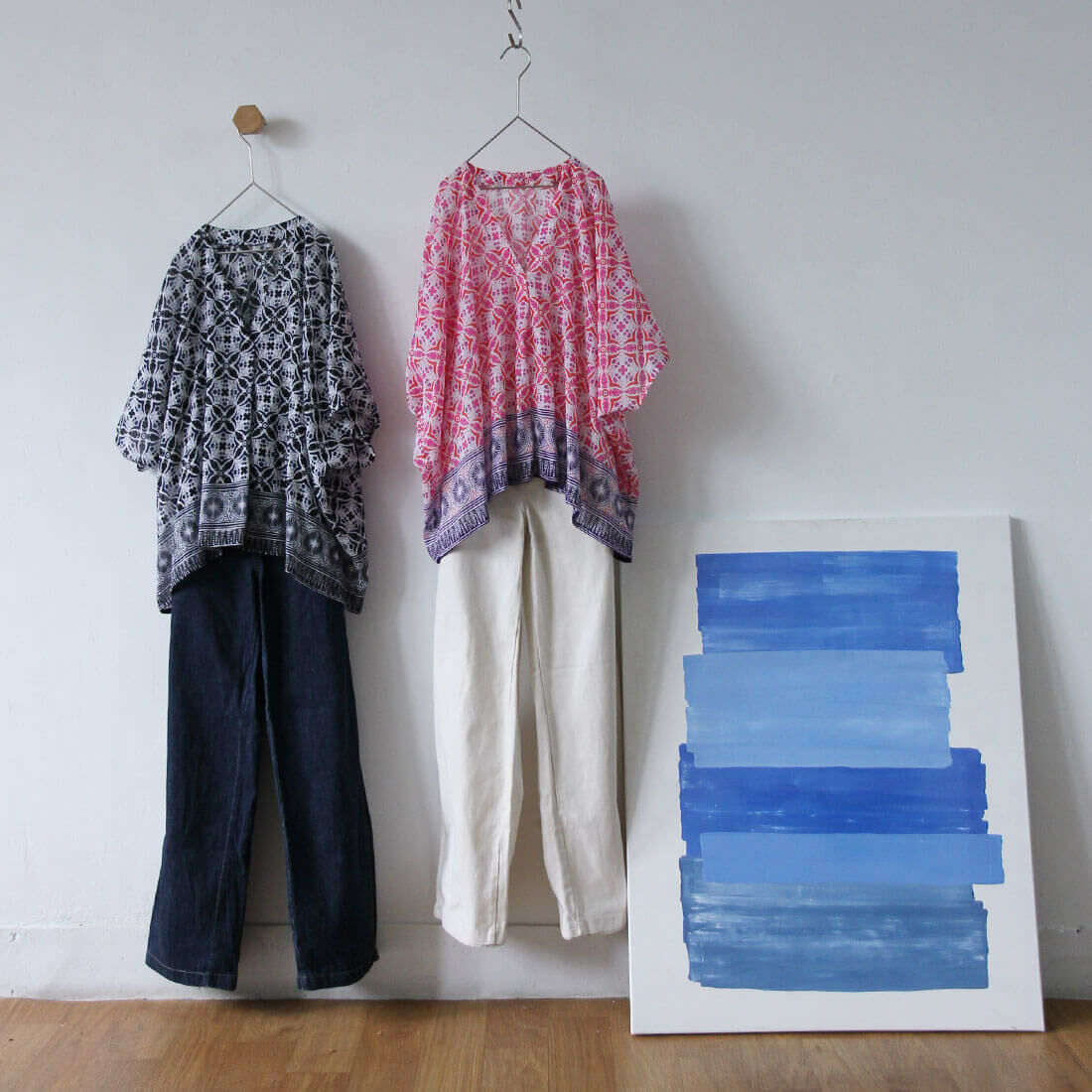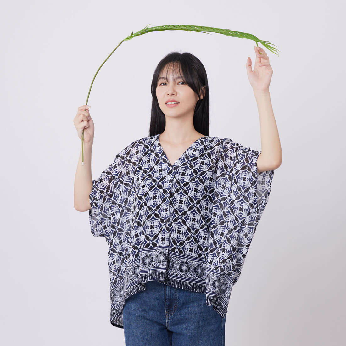 薄透自帶仙氣,穿上這件薄紗略帶透視的印花上衣,讓你感受到熱帶度假的風情。這款上衣搭配一件小背心,恰到好處的透明材質非常適合夏天穿搭。滿版仿木刻印花,帶有濃厚的民俗風氛圍。