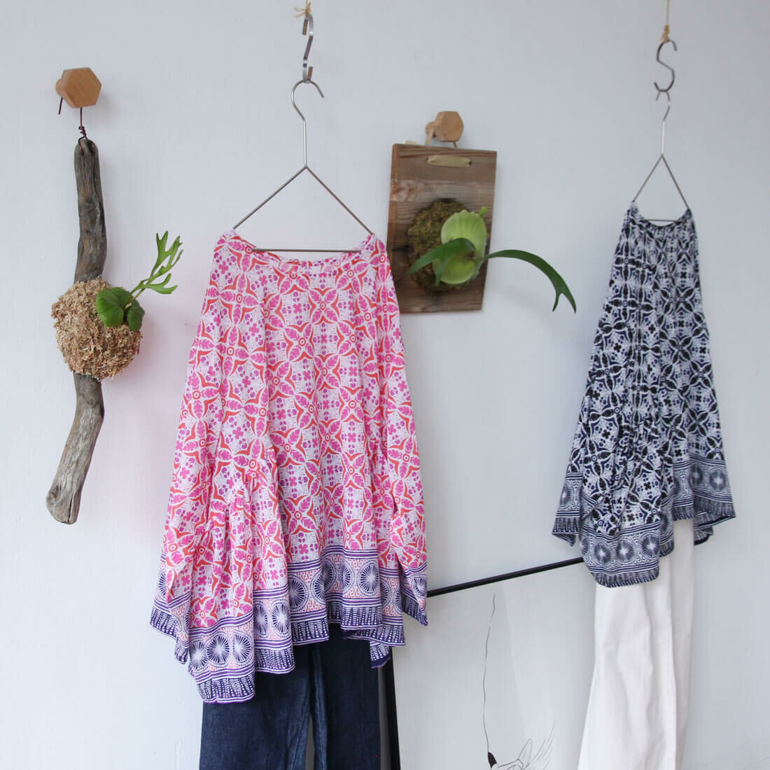 這款輕盈涼爽的棉質上衣,以印度木刻染印風格的印花為特色,散發出自然且隨性的氣息。印花設計與布料相得益彰,穿搭起來輕鬆自在,是度假或日常穿搭的理想選擇。
