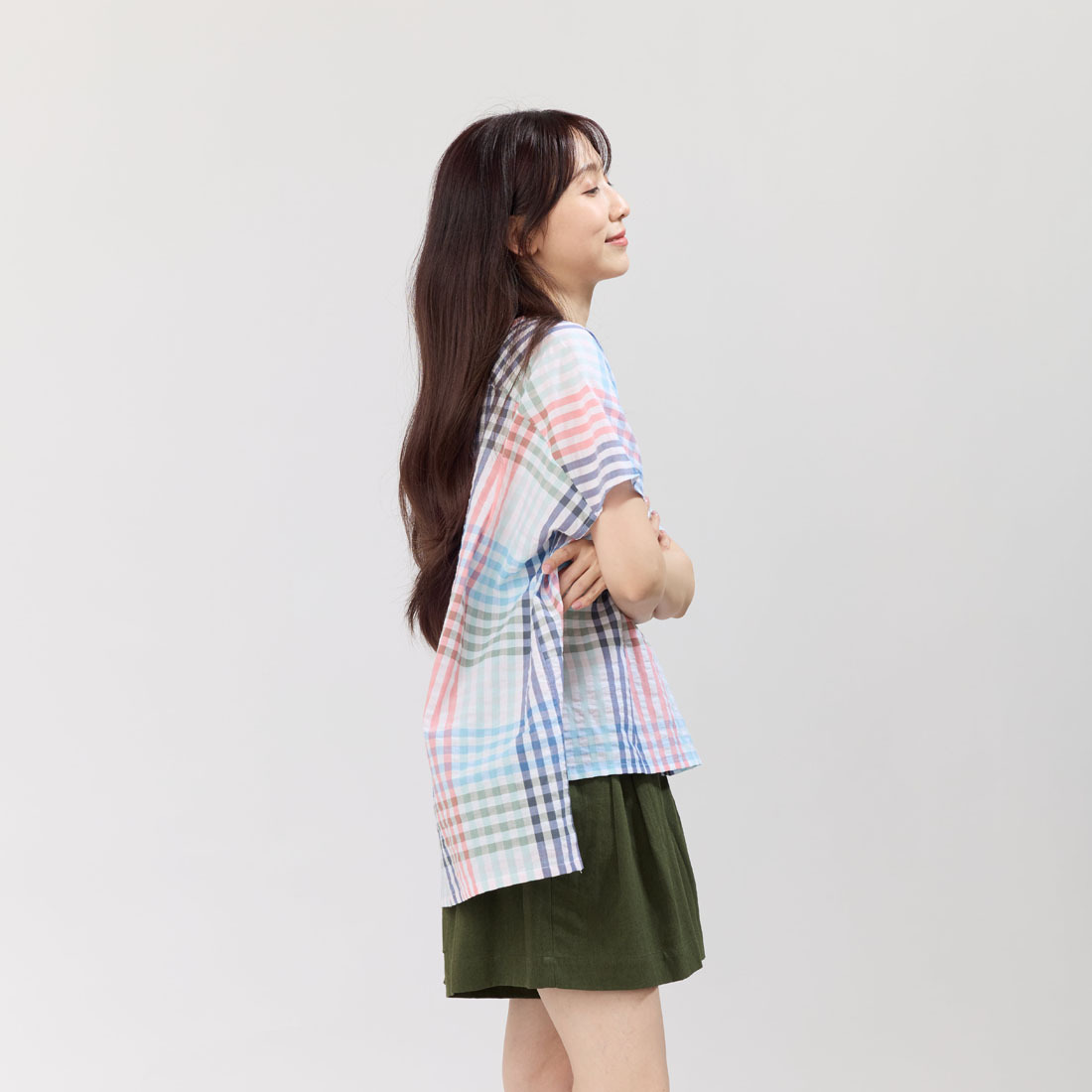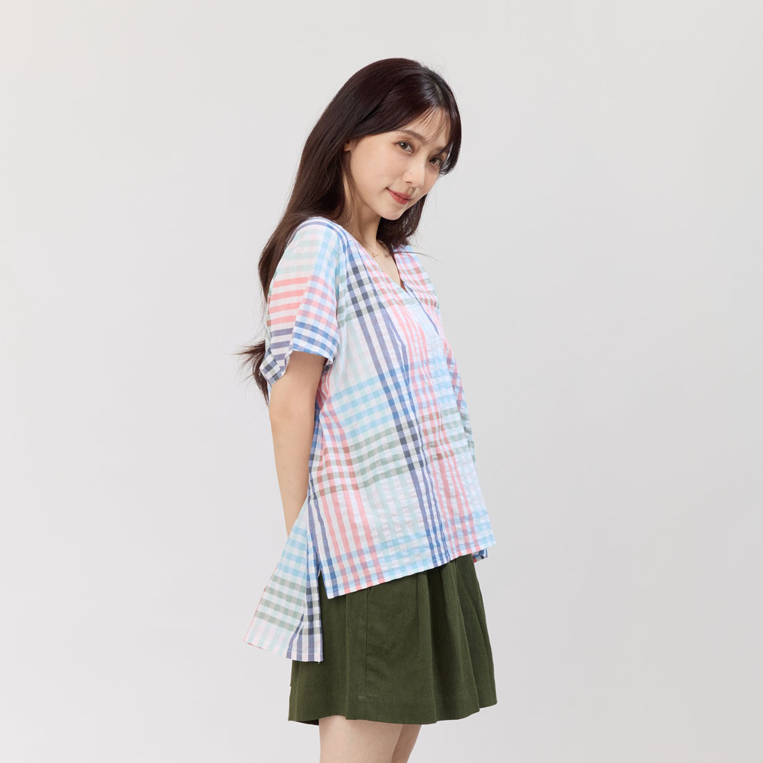 使用台灣製造100%純棉布料,帶有淡粉與粉藍交織的格紋圖樣,透氣柔軟、夏日清新。