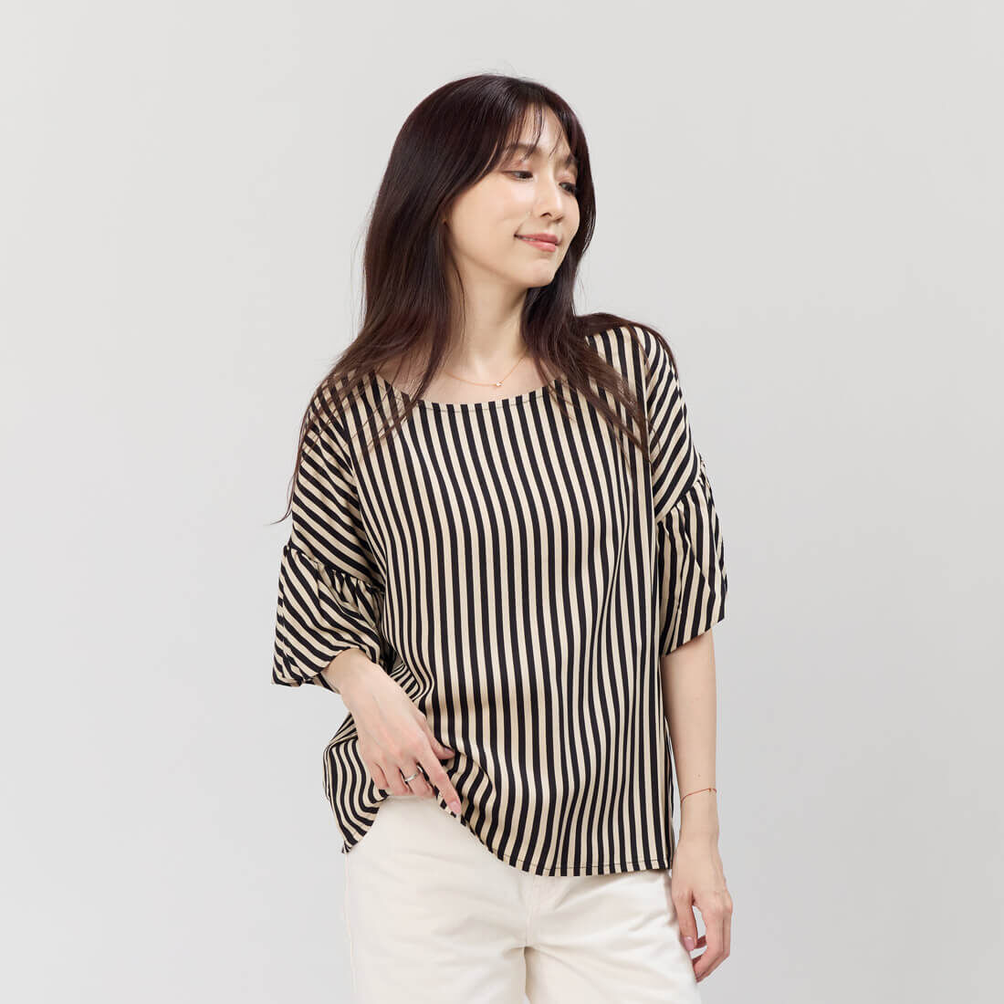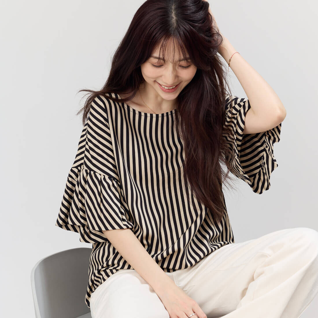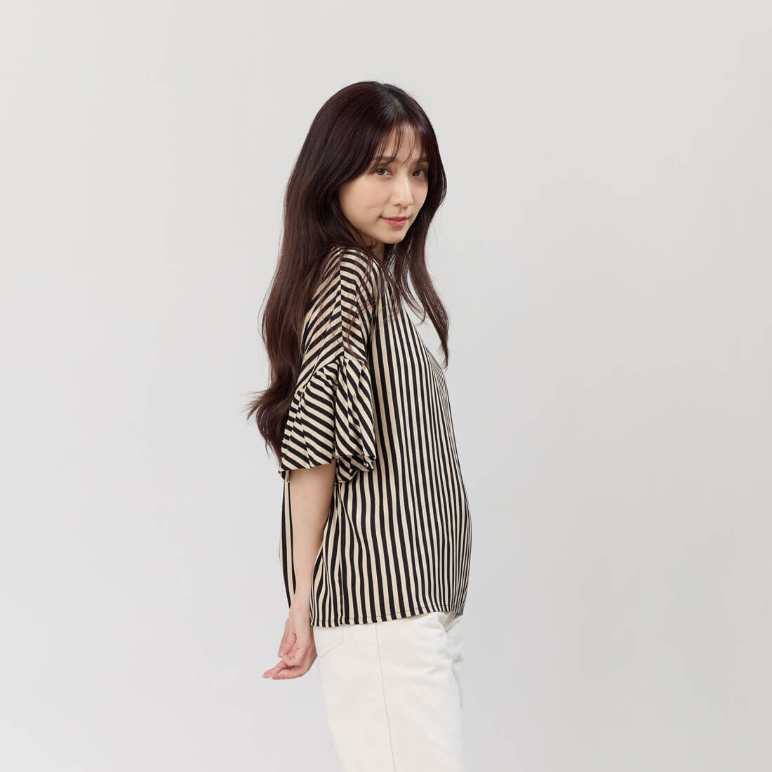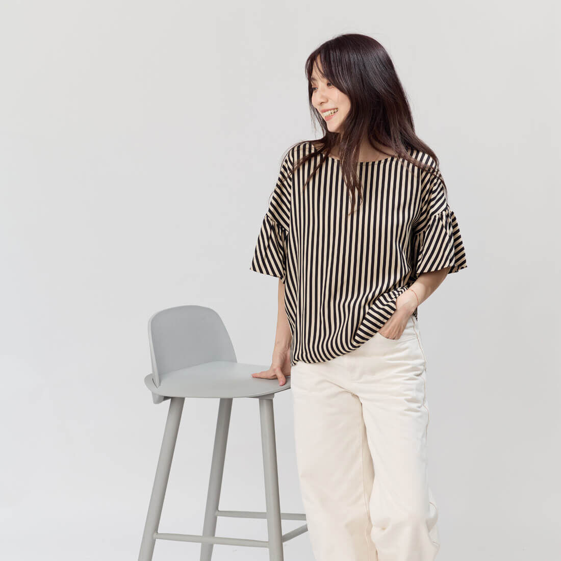 - 向下傘狀荷葉袖設計,修飾手臂曲線