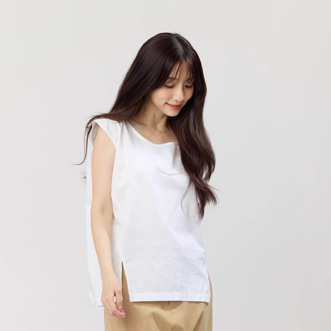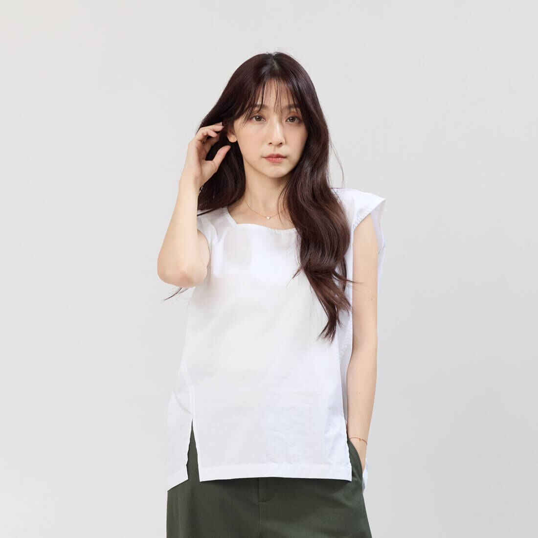 白色純色設計呈現簡約清新風格,為夏季穿搭增添輕鬆自在的氛圍。透氣舒適的布料即使在炎熱的天氣中也能保持乾爽,不會黏膩。精心設計的肩寬與手臂線條,讓您穿著合身舒適,優雅地展現成熟女性的獨特魅力。